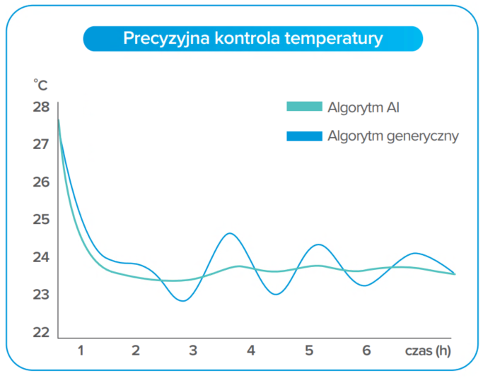 Mniejsze zużycie energii przy lepszej efektywności energetycznej niż w przypadku przenośnego klimatyzatora. Zastosowany zaawansowany algorytm AI zmniejsza wahania temperatury, aby zapewnić płynne chłodzenie przez cały dzień bez utraty komfortu.
